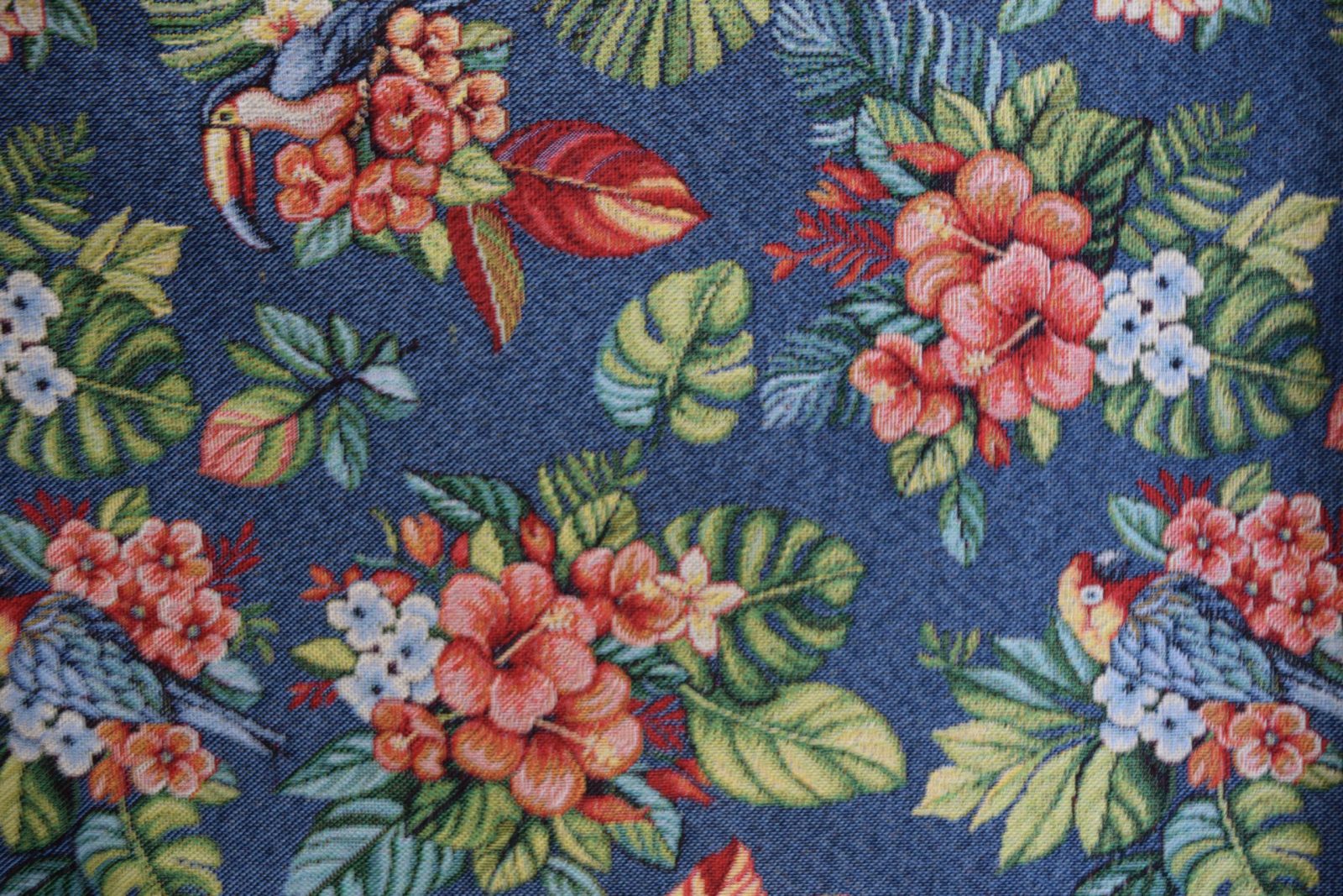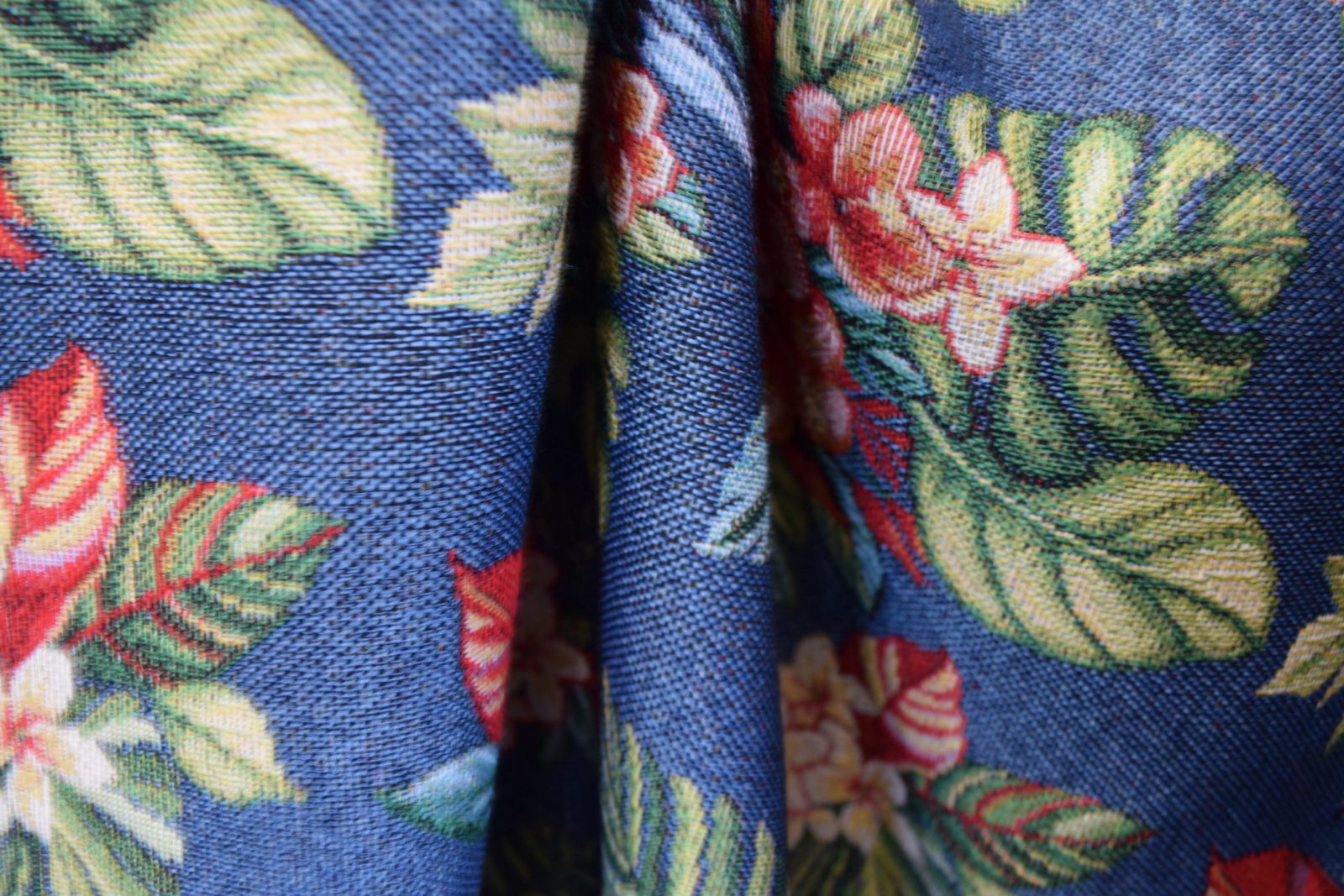 La Tela Janeiro aporta elegancia con su diseño de flores sobre fondo azul en tejido de hilo tintado.