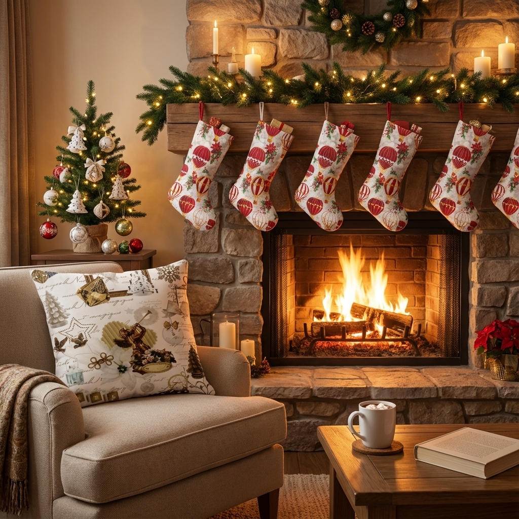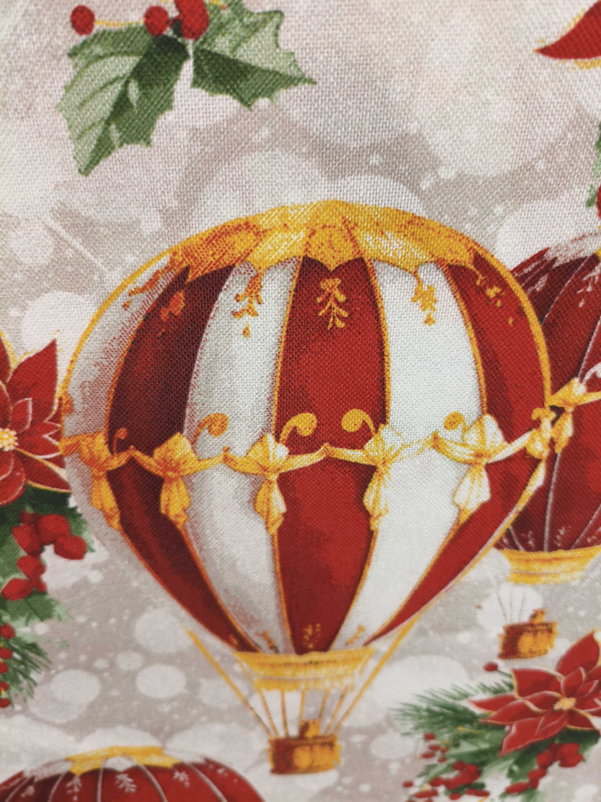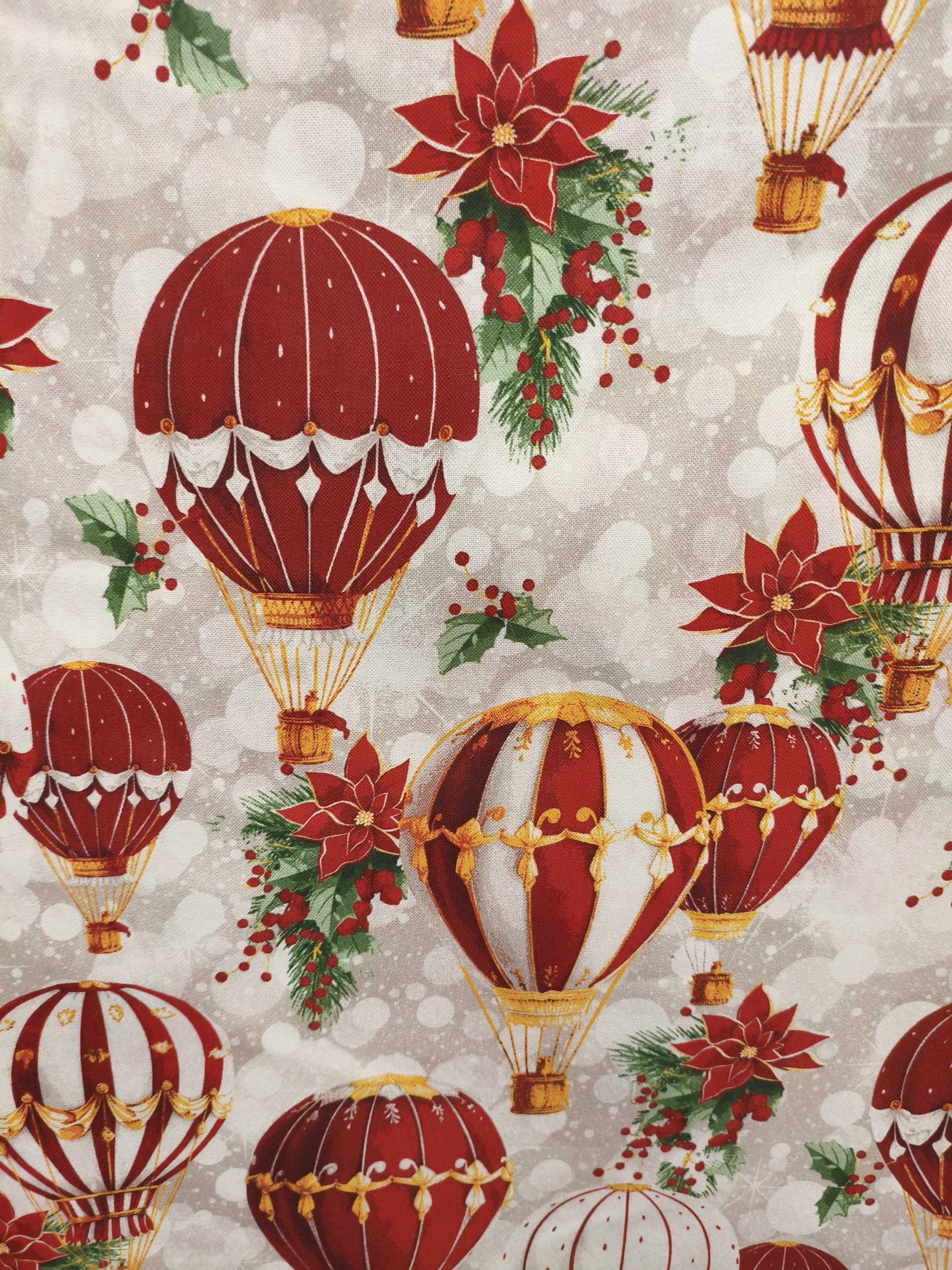 ¡Prepara tu hogar para las fiestas! Esta Tela de Navidad con diseño de globos aerostáticos y motivos invernales es perfecta para crear un ambiente mágico y acogedor.