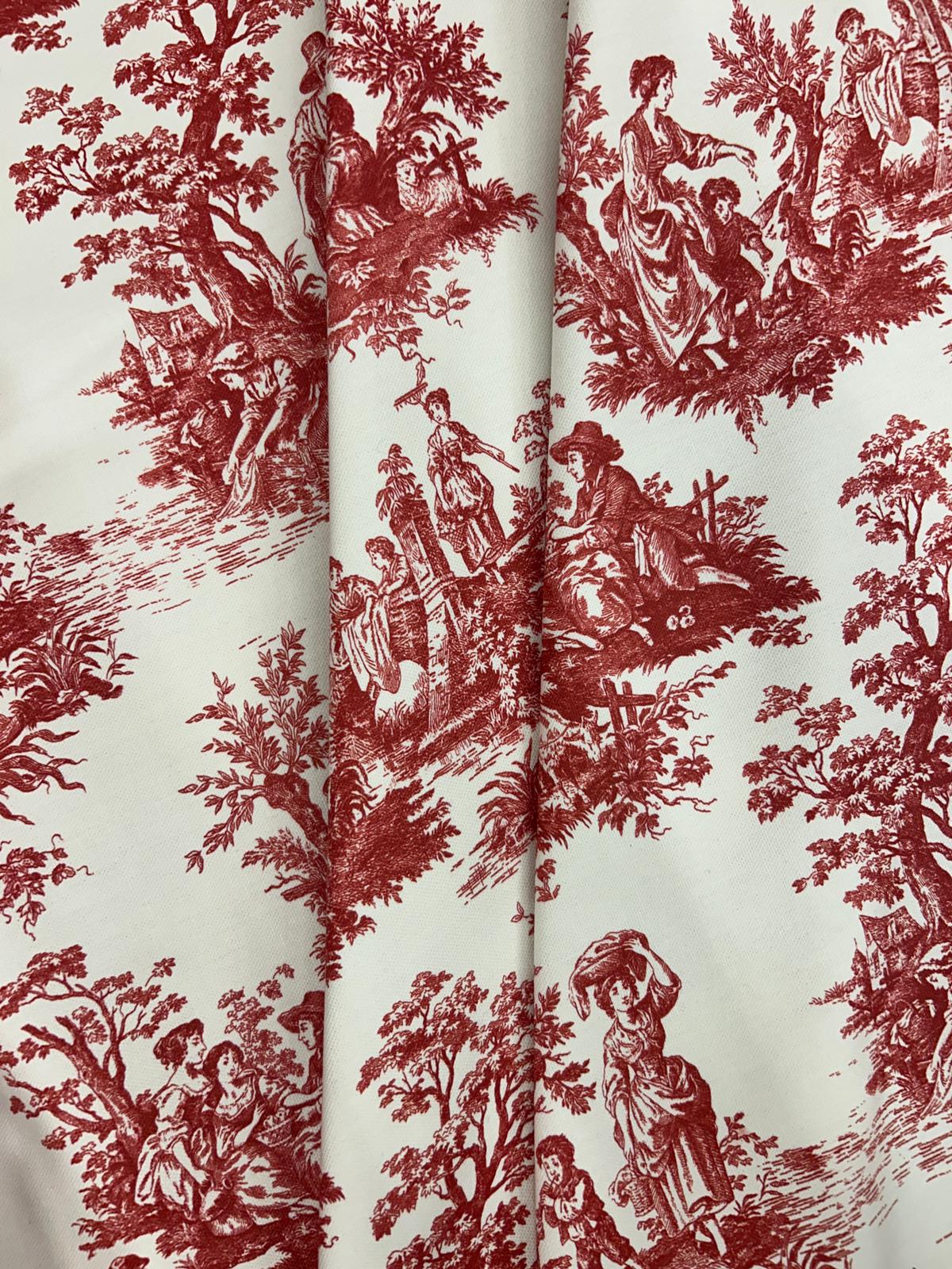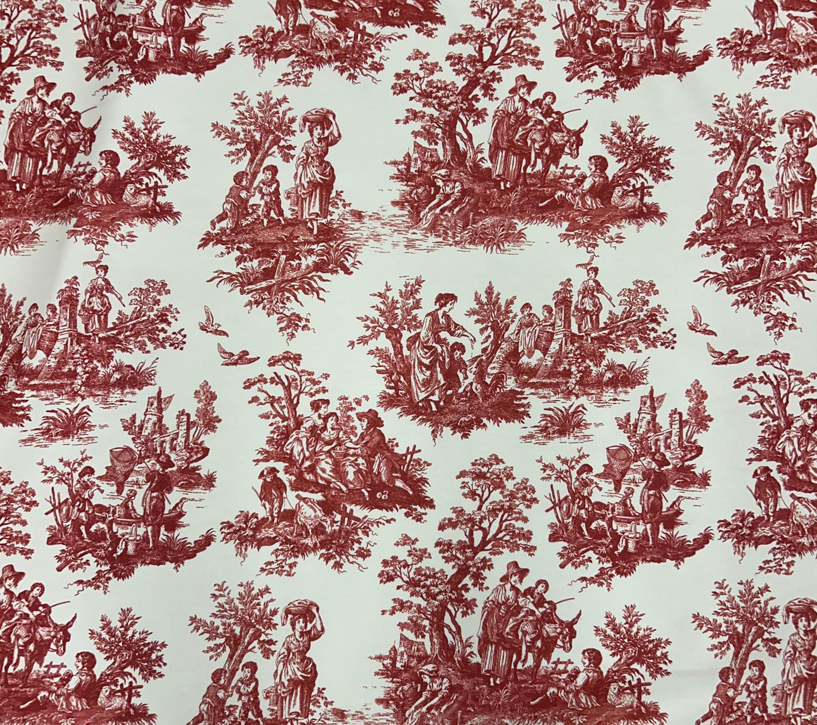 Exclusiva tela de hilo tintado 100% algodón con el inconfundible diseño francés Toile de Jouy. Presenta delicadas escenas campestres sobre un fondo natural, aportando un aire romántico y señorial.