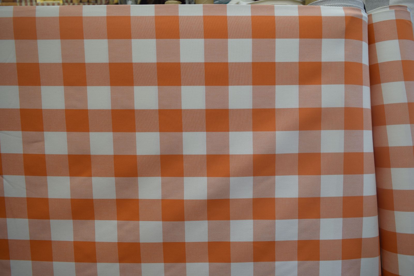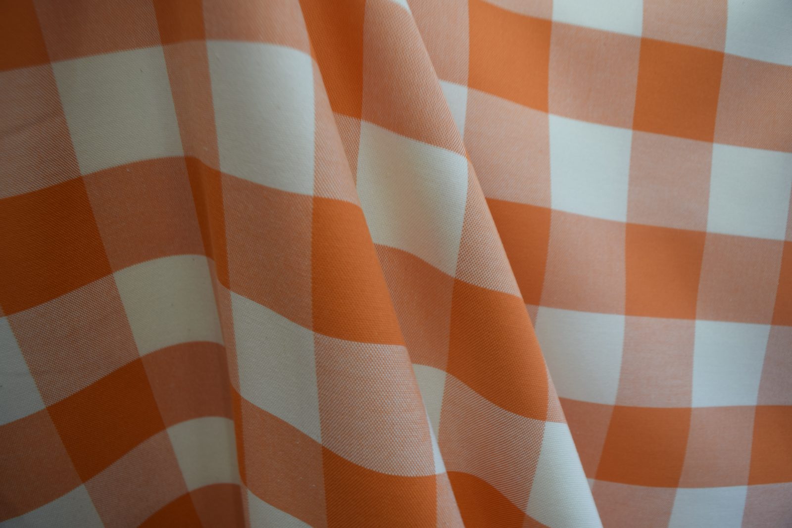 Energía y suavidad natural. El modelo Calpe C/46 presenta un diseño de cuadro Vichy en un naranja vibrante y tamaño grande (4 cm). Está tejido en 100% Algodón de hilo tintado, lo que le confiere un tacto fresco, mate y premium, muy superior al de las mezclas sintéticas.